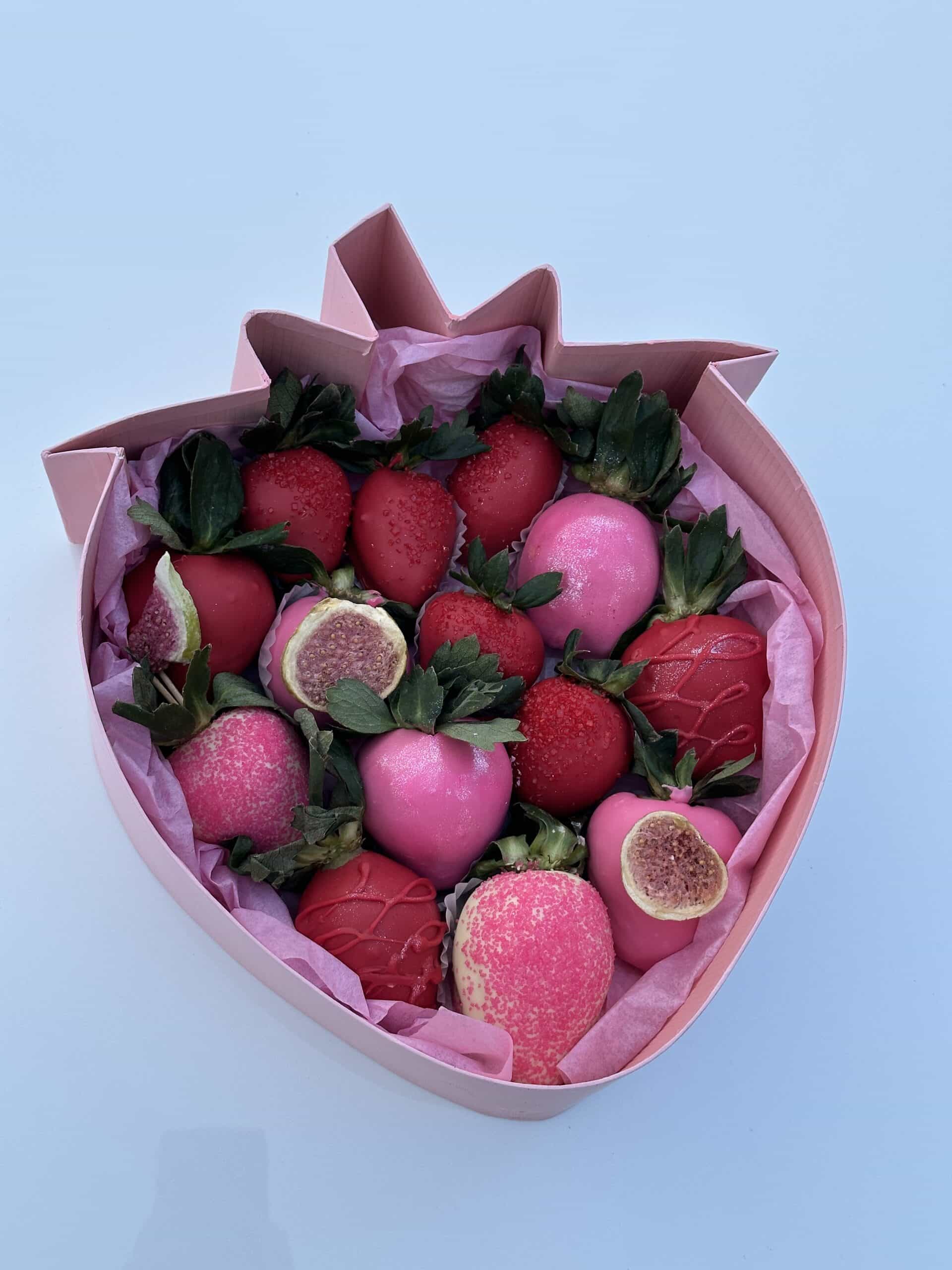 Making a romantic present for your loved ones can be hard. You begin to have doubts about person’s preferences, tastes. You want to make the person as happy as possible. But you have found this set of gorgeous strawberries. Now you can relax as this set will be highly appreciated for sure. The taste of such a desert as chocolate covered strawberries is usually described as extremely delicious, pleasant and enticing. The duet of melting in your mouth Belgium chocolate and sweetness and juiciness of strawberries is perfect due to texture and taste contrast. Combining these two ingredients we get new exquisite taste that is hard forget. Nice strawberry-shaped corduroy box will make presenting and receiving such a gift pleasant and comfortable. Chocolate Covered Strawberry Delivery 7 days a week. Do surprise you beloved people!